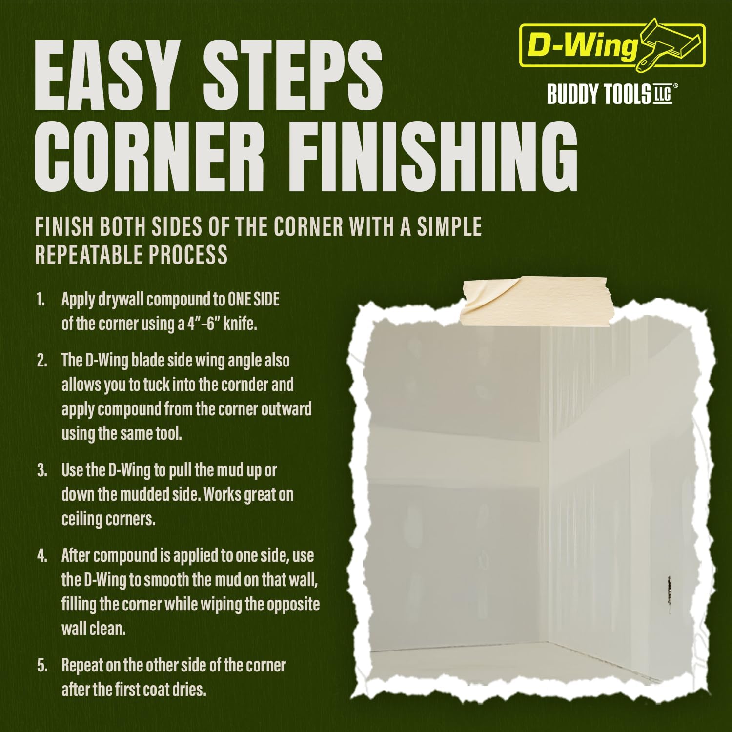 - FAST, CONSISTENT RESULTS: Apply compound to wall with drywall knife, run the D-wing corner tool up or down the corner and wipe clean, repeating on the second side after the first coat dries
